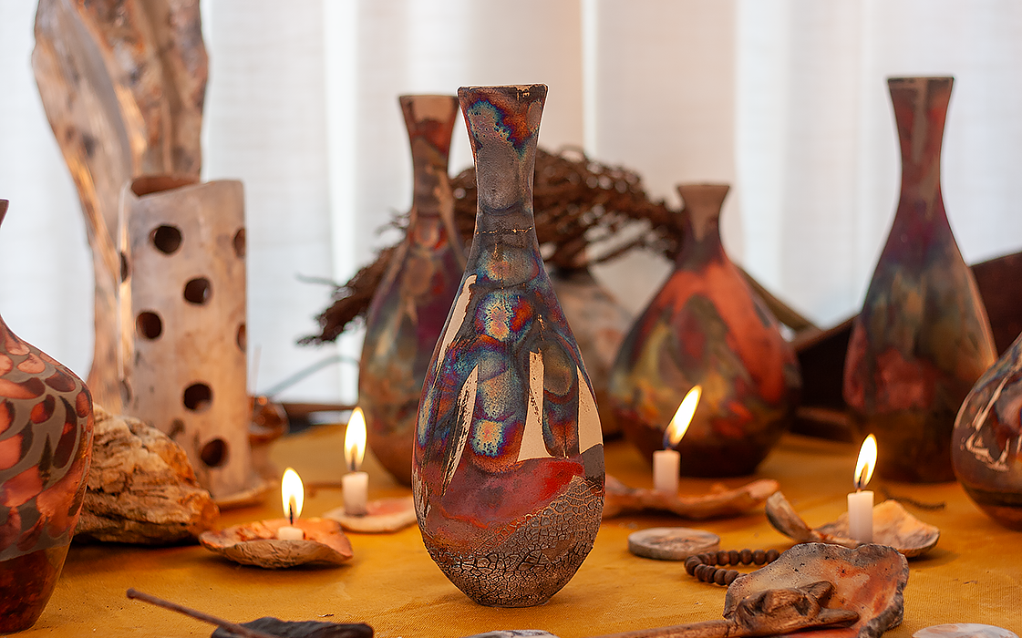 É uma técnica em que a peça é retirada do forno ainda incandescente e recebe a aplicação de matéria orgânica — como penas, pelos, cabelos, crina de cavalo ou açúcar. Ao entrarem em contato com a superfície quente, esses elementos se carbonizam instantaneamente, deixando as marcas de carbono impressas na cerâmica.
